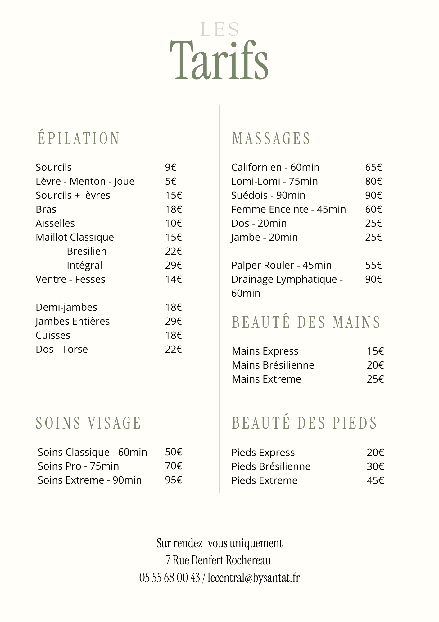 Un soin court et efficace pour relâcher les tensions, stimuler la circulation et retrouver une sensation immédiate de légèreté. 20 min : 25€ Gommage – Dos ou Jambes Exfolie en douceur, lisse la peau et ravive l’éclat. 20 min : 18€ Massage + Gommage Le duo idéal pour détendre et régénérer en profondeur. 45 min : 40€