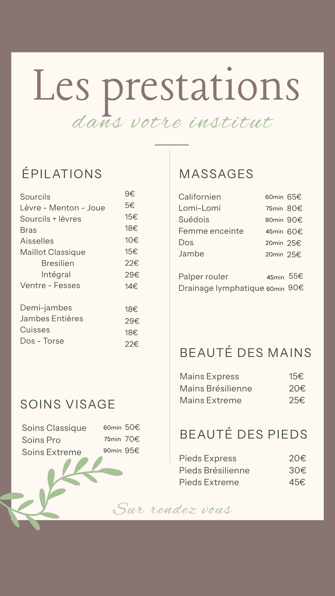 Un soin court et efficace pour relâcher les tensions, stimuler la circulation et retrouver une sensation immédiate de légèreté. 20 min : 25€ Gommage – Dos ou Jambes Exfolie en douceur, lisse la peau et ravive l’éclat. 20 min : 18€ Massage + Gommage Le duo idéal pour détendre et régénérer en profondeur. 45 min : 40€